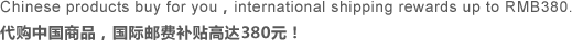 美国,加拿大,澳大利亚(澳洲),新加坡,新西兰,爱尔兰,法国,德国,马来西亚,英国 掏宝(淘宝,Taobao)免国际运费,轻松逛淘宝。全球原价代购掏宝,天猫,当当,京东。零关税,3-5天送货上门,外币付款,免费验货,集中打包。【免运费】 想掏宝,却嫌运费太贵?退货不方便?代购中国一站购, 免费验货,【免运费】,30天全球无理由退换货。马上注册! 关键词:淘宝,掏宝,Taobao,代购; 支持国家:美国,加拿大,澳大利亚(澳洲),新加坡,新西兰,爱尔兰,法国,德国,马来西亚,英国; 服务对象:全球华人 服务模式:全球原价代购 支持网站:淘宝,掏宝,天茂,当当,京东等 关税:零关税 是否免费验货:是 是否集中打包:是 是否送货上门:是 最快送达时间:3-5天 新人是否免国际运费:是